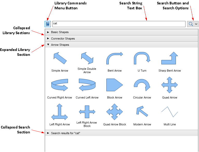 The library browser is a visual component that helps you use, manage and create libraries of shapes. It is organized as a vertically arranged collection of sections. The following picture illustrates the main elements of the library browser: