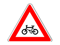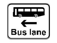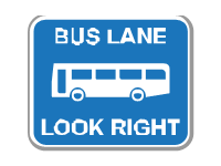 Contra flow bus lane which pedal cycles may also use with traffic approaching from the right (reminder for pedestrians)