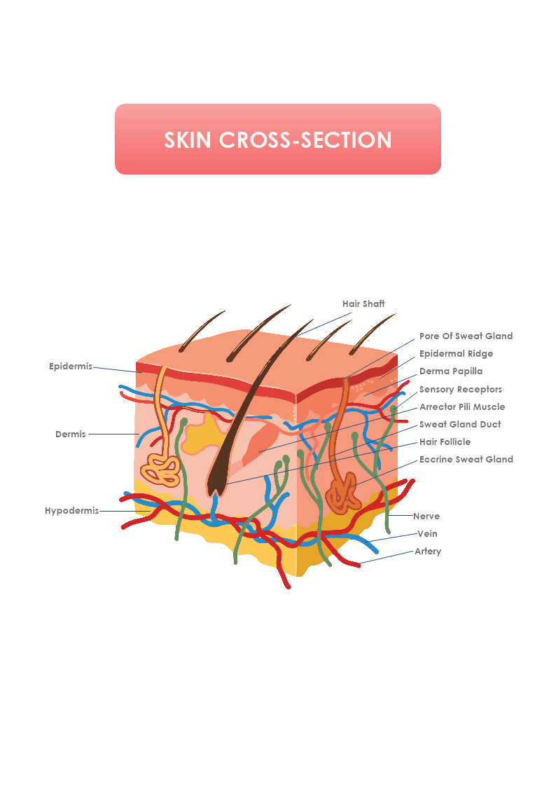 This is a Skin Cross-section template that can be used to identify your type of skin or as an example in a Dermatology clinic. The template is customizable with a few drags and drops in MyDraw.